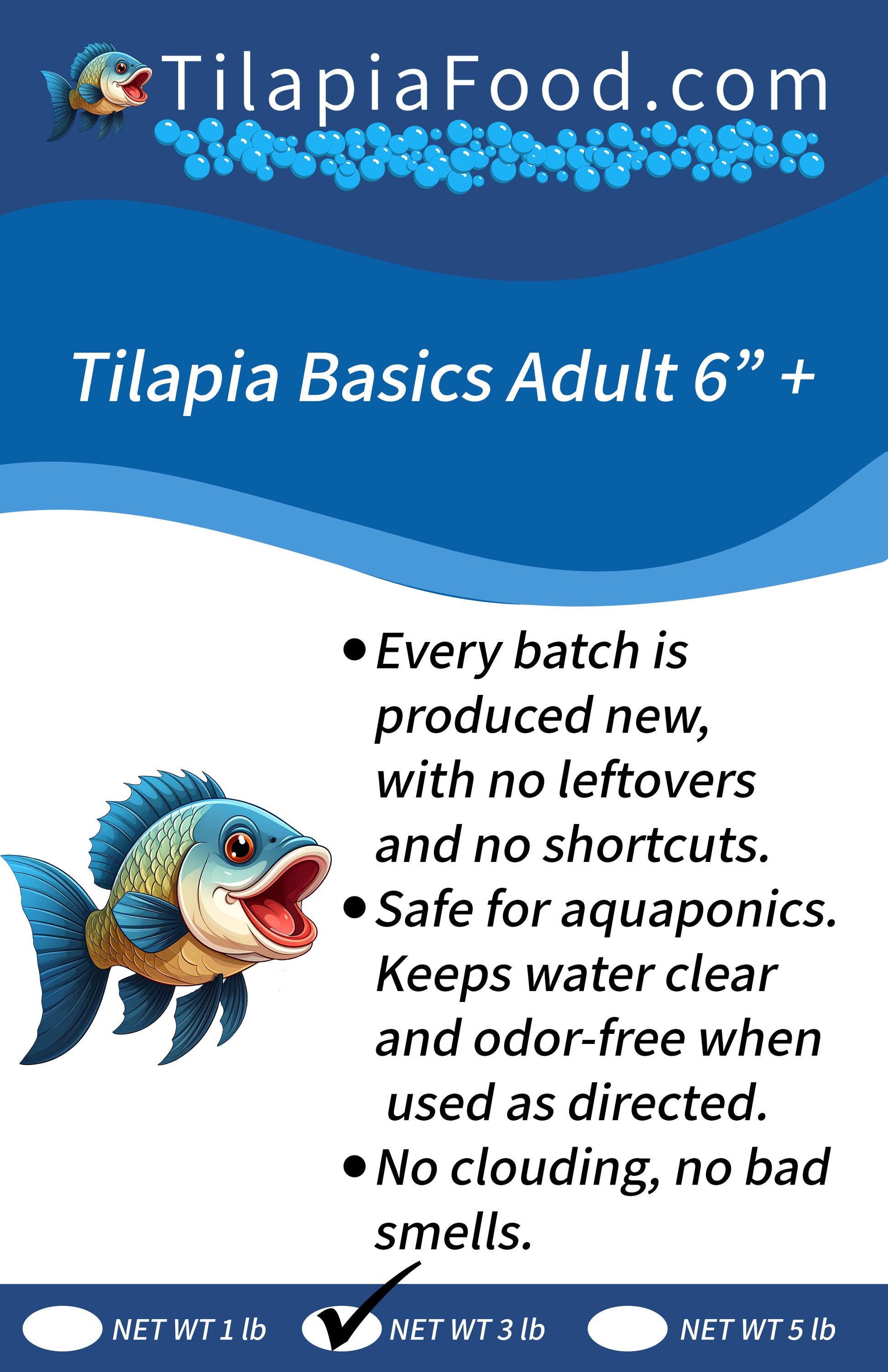 Once tilapia reach 6 inches or larger, they transition to a full‑size floating pellet designed for efficient grow‑out. Tilapia Basics Adult provides a balanced, easy‑to‑digest formula that supports steady weight gain and healthy body condition. The 3/16" floating pellet encourages surface feeding, making it simple to monitor how much your fish are eating and adjust portions as needed.